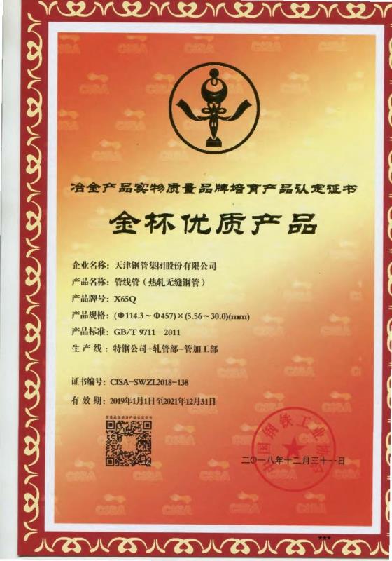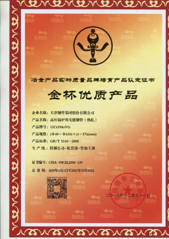 高壓鍋爐用無縫鋼管獲冶金產品實物質量金杯獎